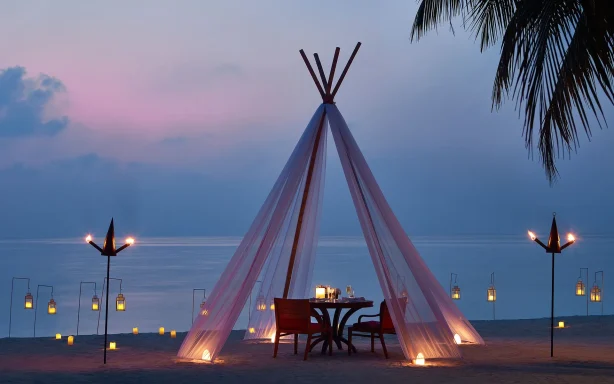 Keys : 86 ⏐ Capacity : Up to 150 guests ⏐ Food & Beverage : In-house catering⏐ Location : Halaveli Island, Maldives⏐Best suited for: Destination weddings and tropical celebrations.