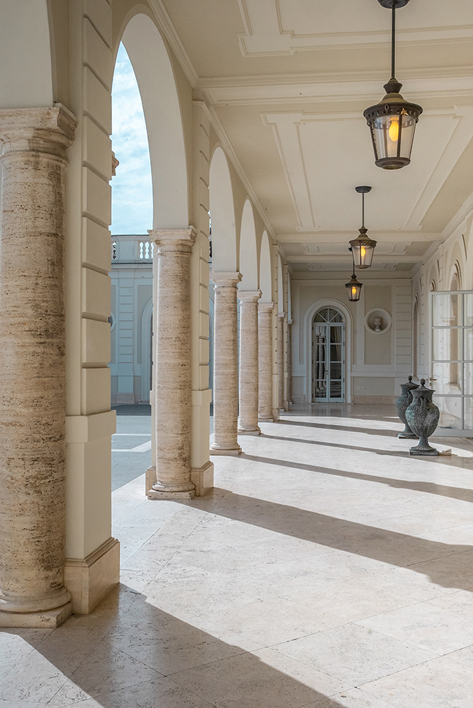 Unlike Rome’s historic palazzi, Villa Miani is defined by openness and perspective. Its architecture is measured and restrained, allowing light, air, and horizon to do the work. Interiors are neutral and spacious, designed to host movement, processions, dinners, dancing, without competing with the setting outside.
