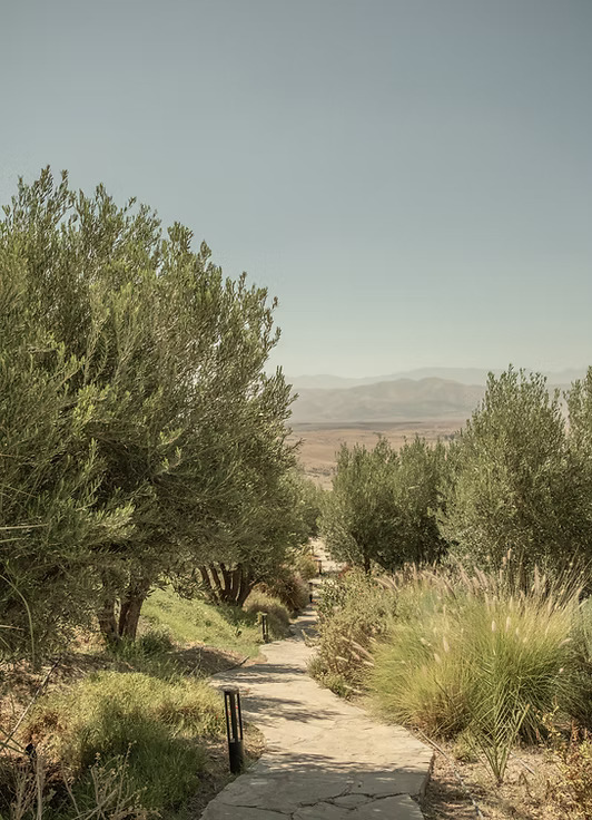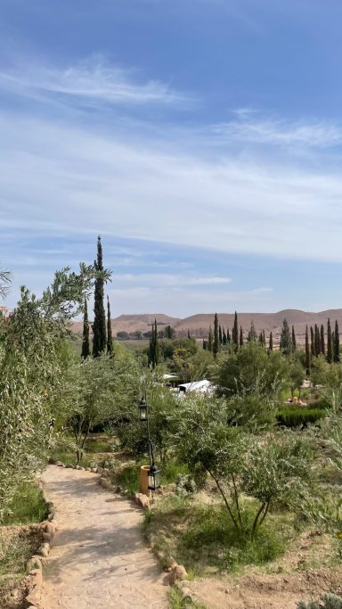 Jnane Tamsna is a privately owned estate in the Palmeraie, created by interior designer Meryanne Loum-Martin as a long term home before opening to guests. The property was designed around gardens first: olive trees, palms, water channels, and open lawns shape how the space is used.