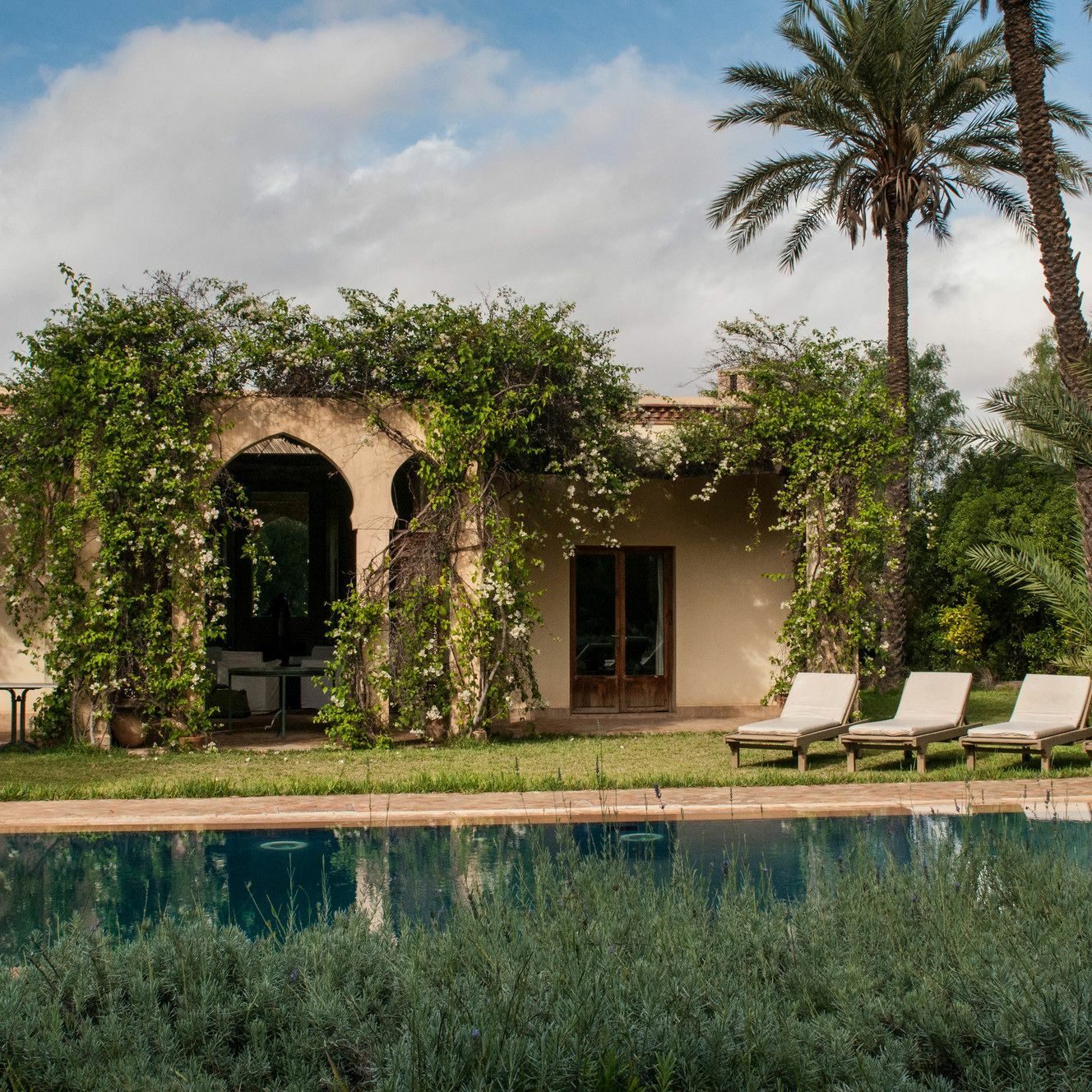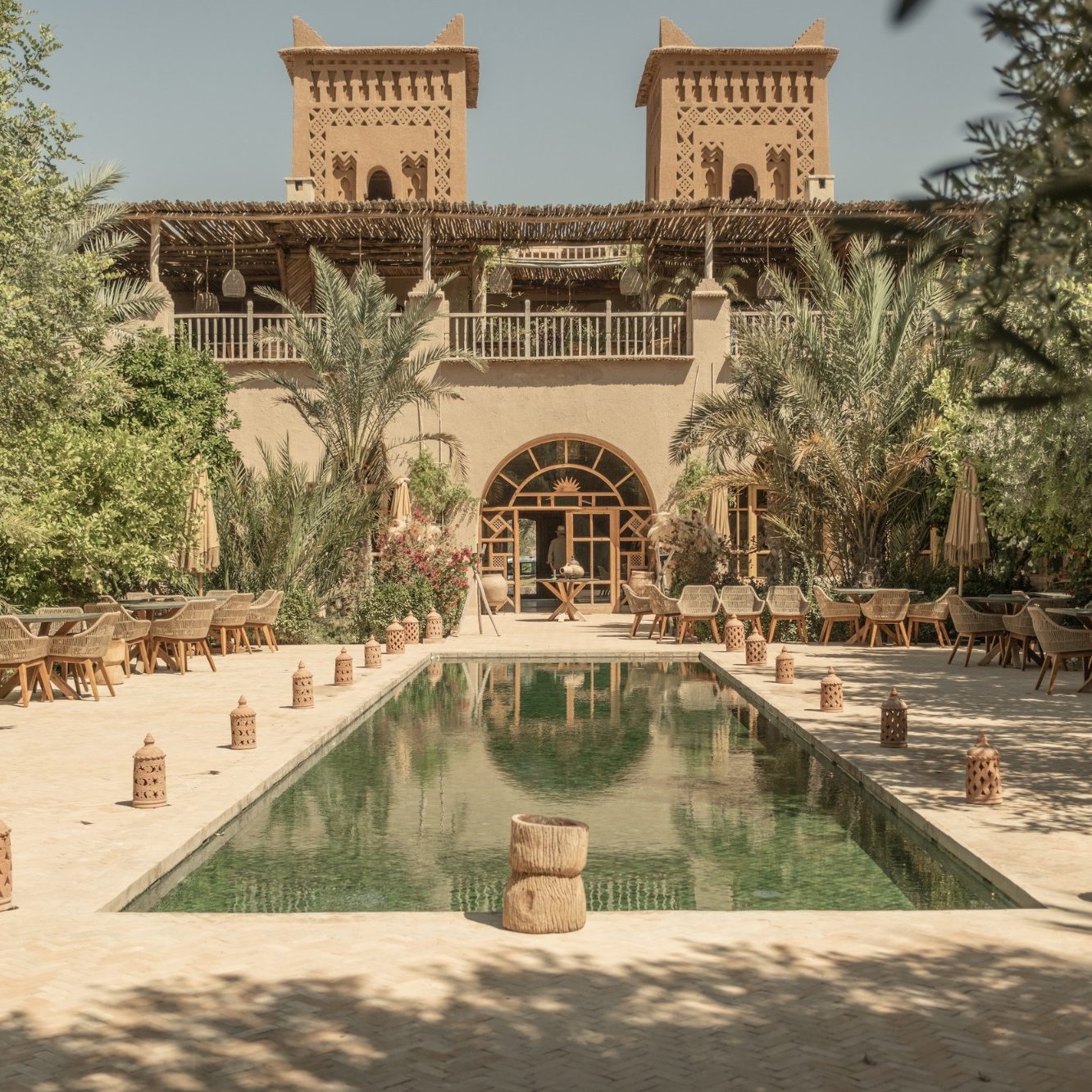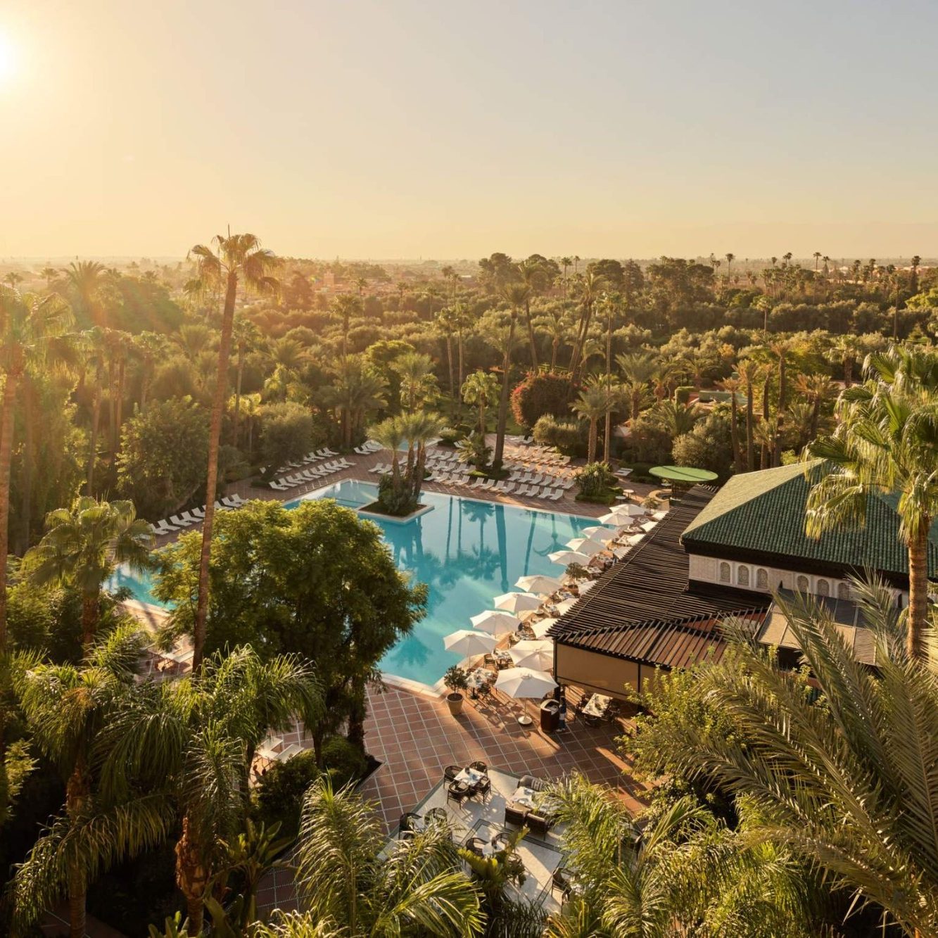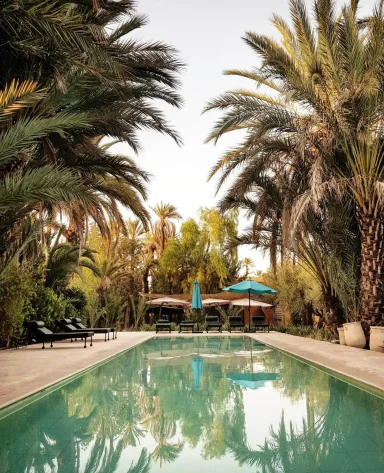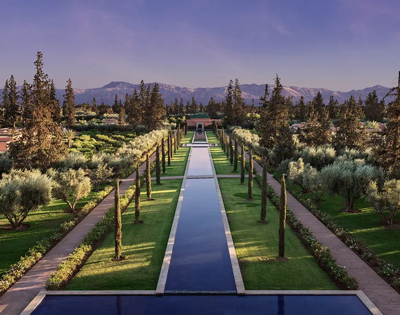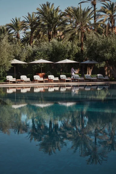 The estate is built around gardens, reflecting pools, and long perspectives, giving it a calm, almost meditative rhythm that feels very different from the density of the medina. Large pools, open terraces, and pavilion-style suites define the experience, making space and light central to how the property is lived in.