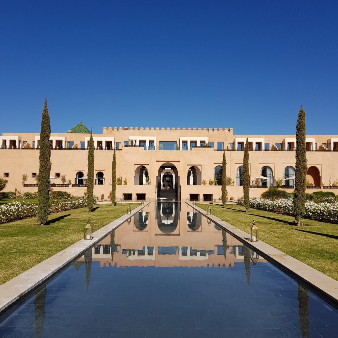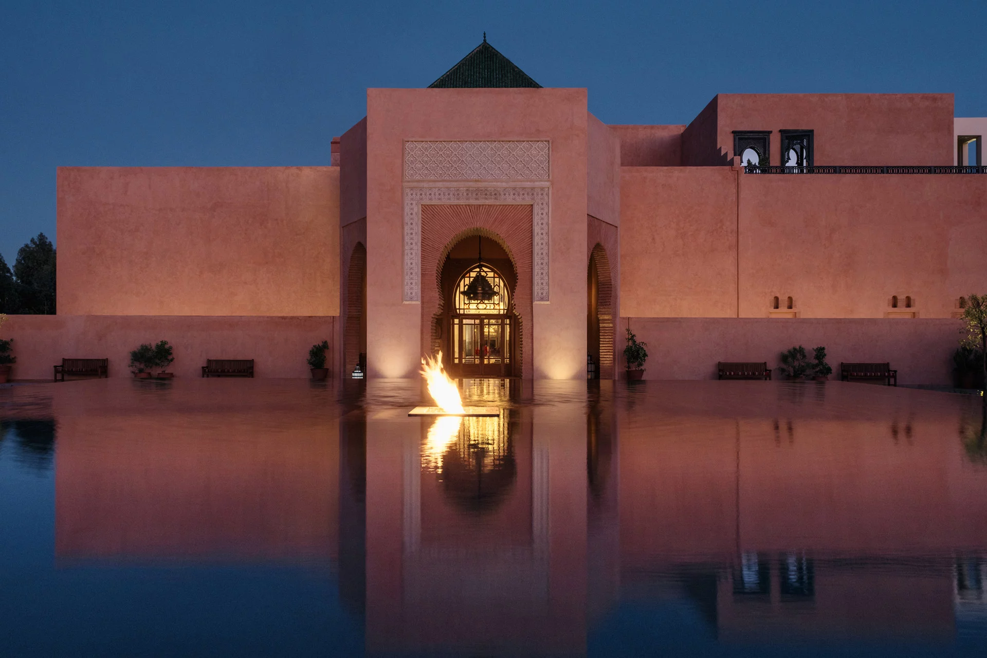 Palais Namaskar sits just outside Marrakech, at the edge of the Palmeraie, with the Atlas Mountains in the distance. Conceived in the early 2010s as a modern palace rather than a traditional riad, it was designed to blend Moroccan architectural codes with Asian-inspired symmetry and water-centered design.